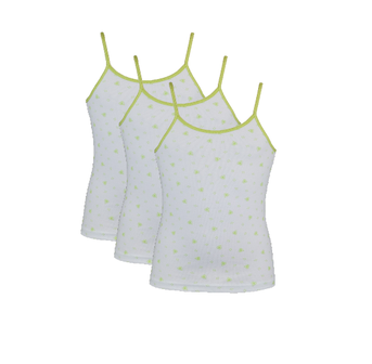 3 Stuks meisjes hemden met spaghettibandjes en een all-over print van hartjes, zonder zijnaden, gemaakt van fijnrib (100% Katoen). De hals en armsgaten zijn afgezet met een elastisch satijnbandje.