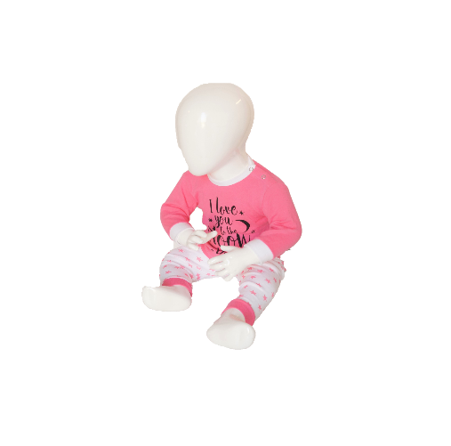 Mooie baby pyjama gemaakt van een mooie zachte fijnrib (100% katoen). De broek heeft een all over print met sterretjes en op het shirt staat een lieve tekst. De hals is afgezet met boord, de mouwen en pijpen met een elastische manchet.