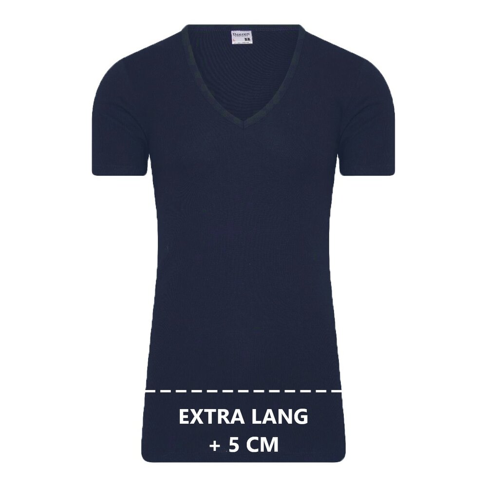 Extra lang aansluitend heren T-shirt met diepe V-hals en korte mouw, zonder zijnaden, gemaakt van 100% katoen. De hals en armsgaten zijn afgezet met boord. Dit T-shirt is 5 cm langer dan normaal. Wanneer men dit shirt onder een overhemd draagt, ziet men geen boordje.